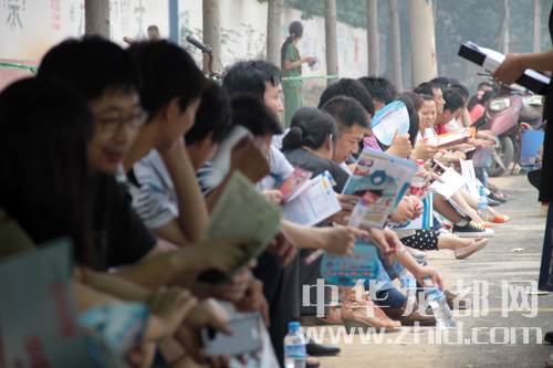 周口一高考點外陪考的家長坐起“長龍”。