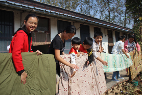 ????上圖:在九九重陽節(jié)來臨之際,為弘揚(yáng)中華民族傳統(tǒng)美德,營造尊老、敬老、愛老、助老的良好風(fēng)尚,項(xiàng)城市開展了“溫暖重陽·關(guān)愛老人”重陽節(jié)慰問活動,為敬老院的老人送去了慰問物品,讓老人們感受到社會的關(guān)愛和溫暖。圖為該市中小學(xué)生在南頓鎮(zhèn)敬老院為老人們晾曬被褥。 張永久 攝