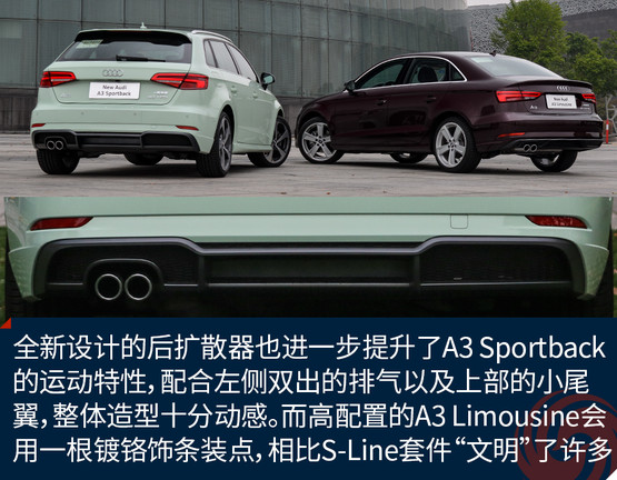 全新設(shè)計(jì)的后擴(kuò)散器也進(jìn)一步提升了A3 Sportback的運(yùn)動(dòng)特性,配合左側(cè)雙出的排氣以及上部的小尾翼,整體造型十分動(dòng)感。而高配置的A3 Limousine會(huì)用一根鍍鉻飾條裝點(diǎn),相比S-Line套件“文明”了許多。與LED矩陣大燈相呼應(yīng)的是全LED尾燈,兩者相輔相成為新車帶來(lái)了更強(qiáng)的攻擊性以及橫向視覺(jué)延展性,新加入的流動(dòng)式轉(zhuǎn)向燈在美觀的同時(shí)也提升了整車的科技感。