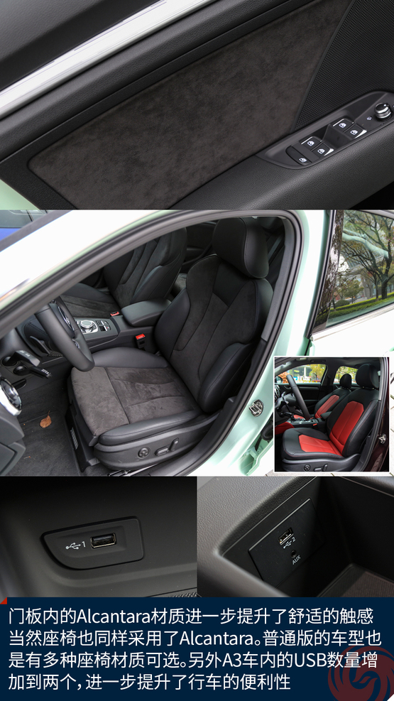 相比較外觀的改變,內(nèi)飾的變化就要少了一些,最直觀的變化莫過(guò)于全新設(shè)計(jì)的真皮方向盤(pán),不僅好看也十分的好用,發(fā)光的迎賓踏板進(jìn)一步增加了車輛的高級(jí)感,中控面板上的鋁合金材質(zhì)的裝飾條質(zhì)感出色,不僅如此,還有多種樣式和材質(zhì)可選;而門(mén)板內(nèi)的Alcantara材質(zhì)進(jìn)一步提升了舒適的觸感,當(dāng)然座椅也同樣采用了Alcantara。另外新增加的USB接口也進(jìn)一步增加了行車的便利性,這也讓A3車內(nèi)的USB數(shù)量增加到兩個(gè)。同時(shí),全新設(shè)計(jì)的MMI系統(tǒng)操作起來(lái)也更加便利,邏輯也更加清晰,并且與7英寸液晶顯示屏均成為標(biāo)準(zhǔn)配置,微微朝向駕駛員的設(shè)計(jì)也更加合理,同時(shí)還支持CarPlay。