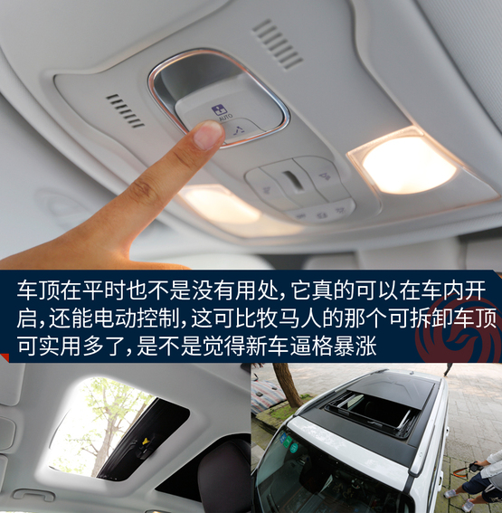 敞篷版車型將普通車型的天窗玻璃全部換成了可拆卸的頂棚,拆卸過程十分方便,即使是女性車主也能輕松拆卸。而且最重要的一點(diǎn)是這個(gè)頂棚不只是樣子貨,平時(shí)放在車頂時(shí),車內(nèi)可進(jìn)行操作,把它變成一個(gè)電動天窗來用,是不是感覺特高端?
