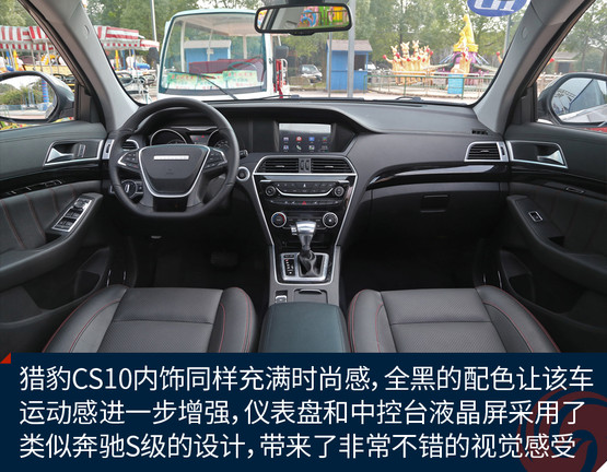 獵豹CS10內(nèi)飾同樣充滿時(shí)尚感,全黑的配色讓CS10的運(yùn)動(dòng)感進(jìn)一步增強(qiáng),儀表盤(pán)和中控臺(tái)液晶屏采用了類(lèi)似奔馳S級(jí)車(chē)型的貫通式設(shè)計(jì),帶來(lái)了非常不錯(cuò)的視覺(jué)感受。用料方面,中控臺(tái)上方面板為搪塑工藝,手感較軟,并且還進(jìn)行了仿縫線處理,讓整個(gè)內(nèi)飾看起來(lái)很有質(zhì)感。