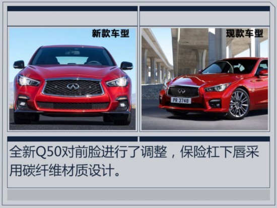 全新英菲尼迪Q50對外觀進行了調(diào)整,前臉采用上下分體式格柵設(shè)計,上格柵為網(wǎng)狀造型,保險杠下唇為碳纖維材質(zhì)。車尾取消了車牌下方鍍鉻飾條以及兩側(cè)反光板,下方保險杠換裝黑紅雙色護板。