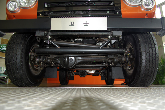 ????衛(wèi)士的底盤(pán)前視,衛(wèi)士作為一款硬派越野車(chē),最小離地間隙達(dá)到了323mm(從圖上可以看到這一最小間隙位于前軸的差速器鼓包處),320mm的最小離地間隙意味著什么?一個(gè)人平躺在地面上,衛(wèi)士能從上方駛過(guò)而人不會(huì)有任何損傷。相比于一般SUV的200mm左右的最小離地間隙,衛(wèi)士顯然不在一個(gè)層級(jí)上。