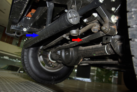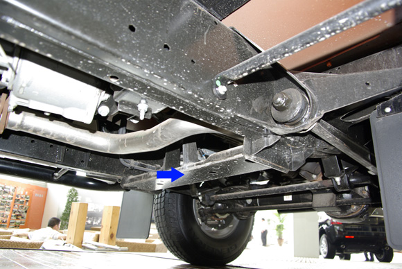 ????后軸特寫(xiě)圖二,藍(lán)色箭頭所指為拖臂,紅色箭頭所指為后防傾桿,對(duì)于衛(wèi)士的車(chē)重而已,其粗細(xì)不能提供很好的仿側(cè)傾效果。后軸依然采用螺旋彈簧作為彈性元件。