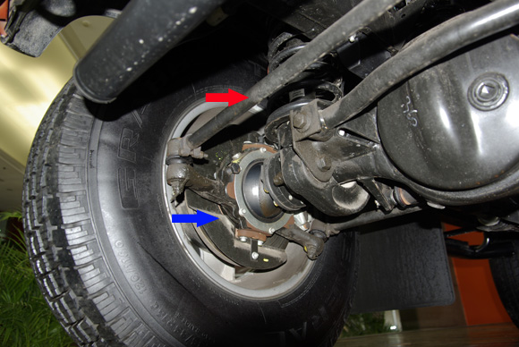 ????上圖為前軸轉(zhuǎn)向系統(tǒng)特寫(xiě),紅色箭頭為轉(zhuǎn)向拉桿,它負(fù)責(zé)拉動(dòng)前輪產(chǎn)生左右的轉(zhuǎn)向。衛(wèi)士的轉(zhuǎn)向機(jī)構(gòu)比較特別,其羊角與硬軸直接采用了球頭的連接方式(藍(lán)色箭頭所指),整個(gè)羊角包裹住球頭,可以產(chǎn)生任意方向的旋轉(zhuǎn),這比起傳統(tǒng)的靠上下轉(zhuǎn)點(diǎn)定位旋轉(zhuǎn)的前軸,前輪的傾角和束角能在更大的范圍內(nèi)活動(dòng)。