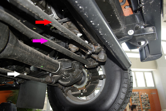 ????前軸特寫(xiě)二,玫紅色箭頭為橫向推力桿,紅色為轉(zhuǎn)向拉桿,白色的拉桿連接左右的羊角,紅色的轉(zhuǎn)向拉桿帶動(dòng)衛(wèi)士的右前輪轉(zhuǎn)向,通過(guò)白色的拉桿聯(lián)動(dòng)左前輪,使左右前輪同步的進(jìn)行轉(zhuǎn)向。