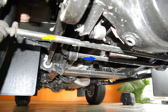 ????上圖中橙黃色箭頭為前軸的限位拉桿,不僅限制前軸自身發(fā)生扭轉(zhuǎn),也可對(duì)前軸的相對(duì)車(chē)架的前后位置進(jìn)行限制。藍(lán)色箭頭為前防傾桿,目測(cè)粗細(xì)并不算大,相信這也跟衛(wèi)士不看重公路性能有關(guān)。