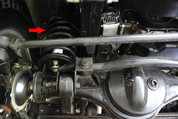????衛(wèi)士的后軸采用拖臂式后懸,紅色箭頭所指的拉桿就是拖臂。左右各一根,拖臂及避震機(jī)對(duì)后軸的自由度進(jìn)行控制,后軸相對(duì)車(chē)架的位置和自身的扭轉(zhuǎn)都得到了控制。