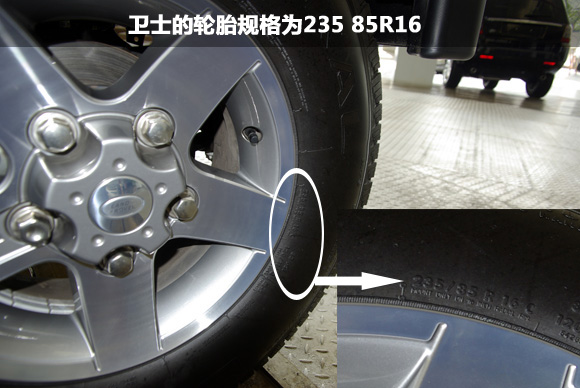 ????衛(wèi)士冰火版的輪胎采用了扁平比厚達(dá)85的輪胎,胎寬為235mm,純粹的越野取向,粗大的輪胎顆??梢詰?yīng)對(duì)野外各種地面條件,依然提供可靠的抓地,但面對(duì)城市中的柏油路面,則不一定能提供良好的抓地。