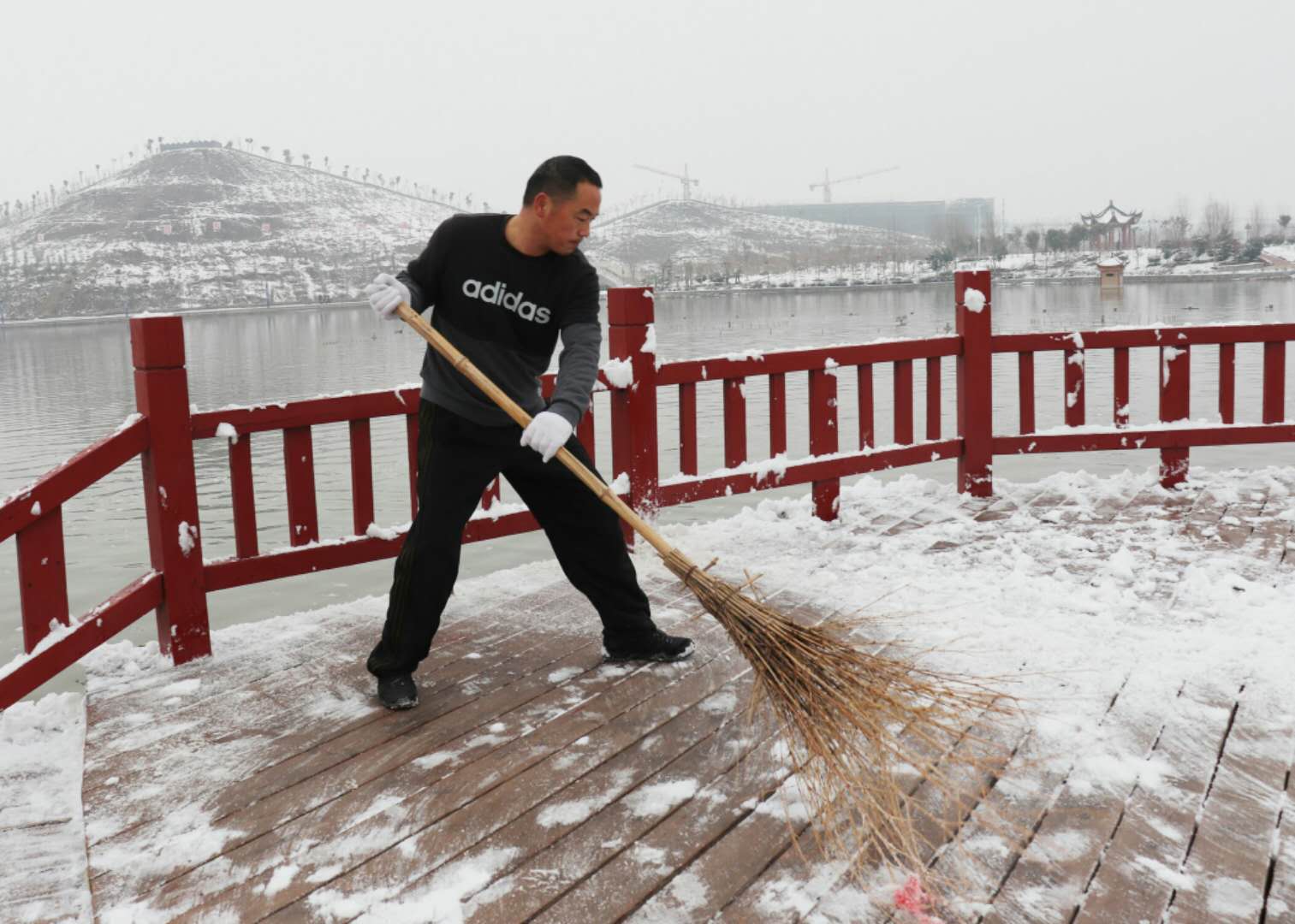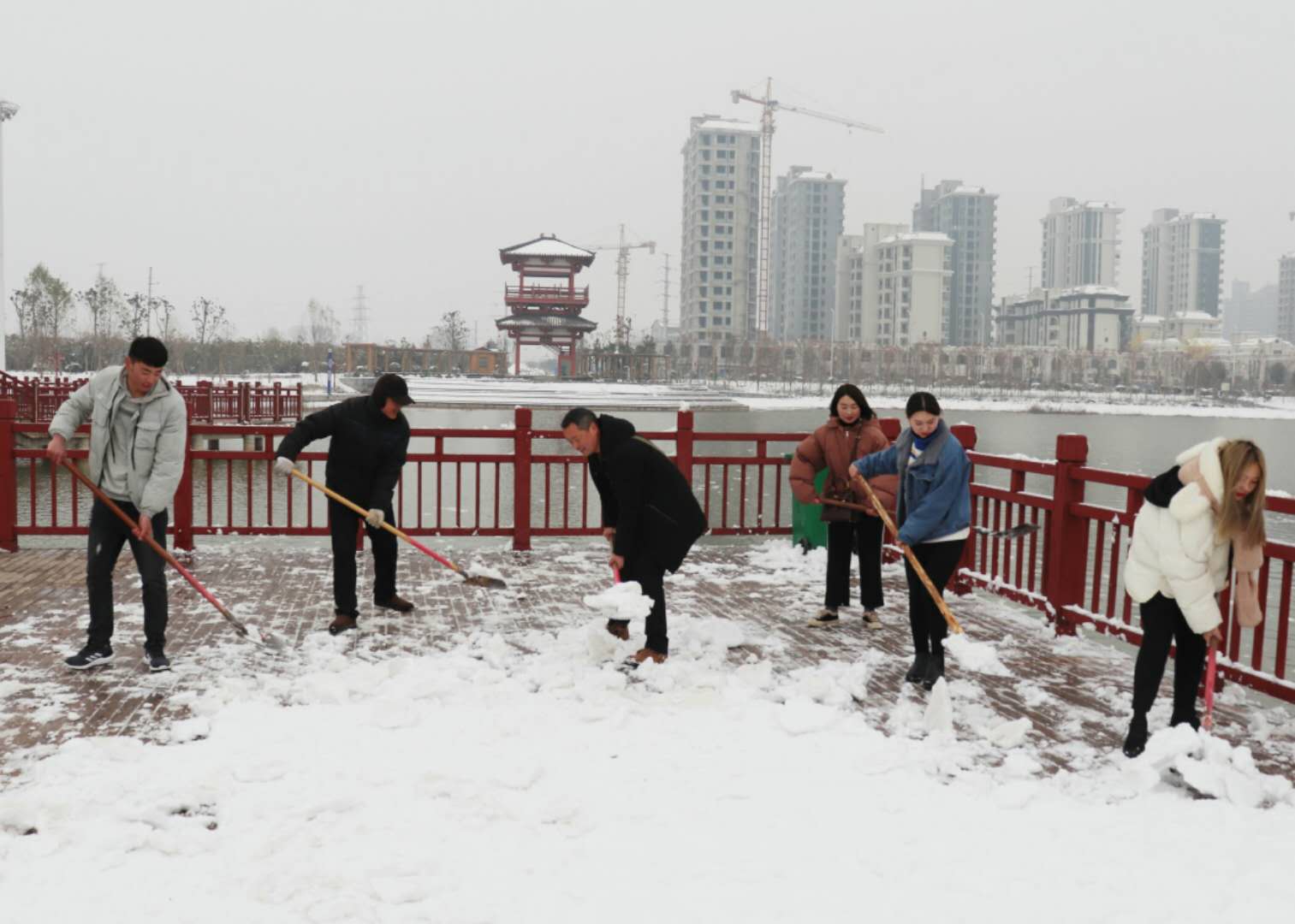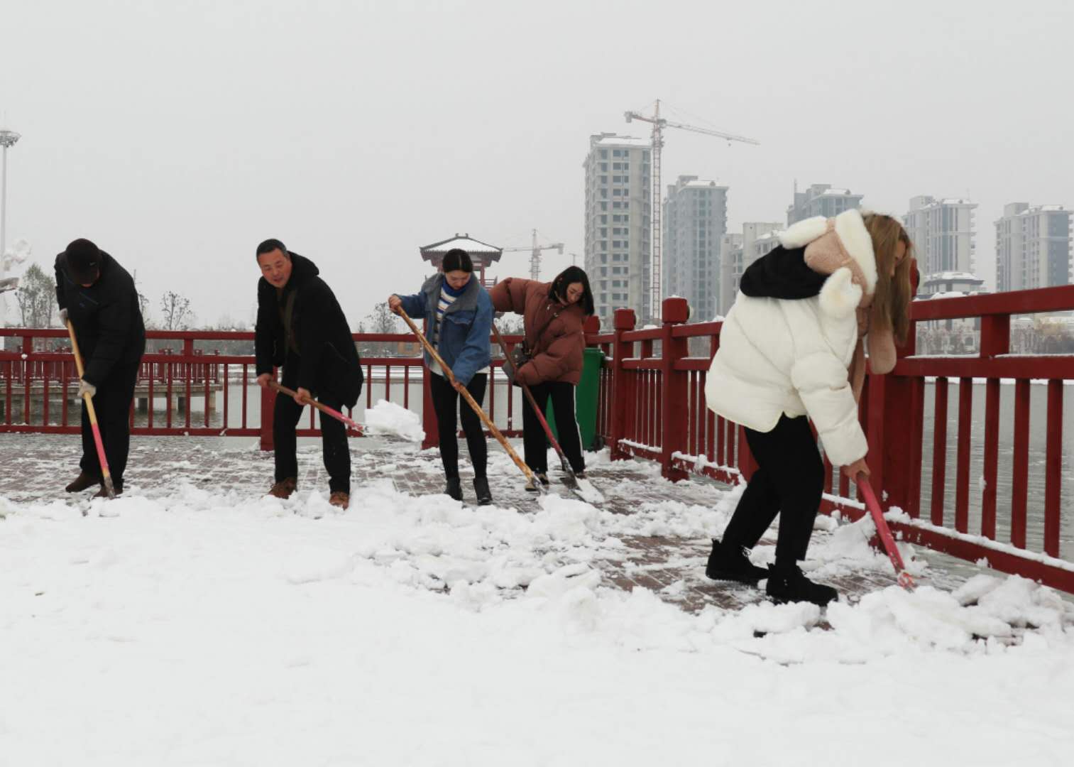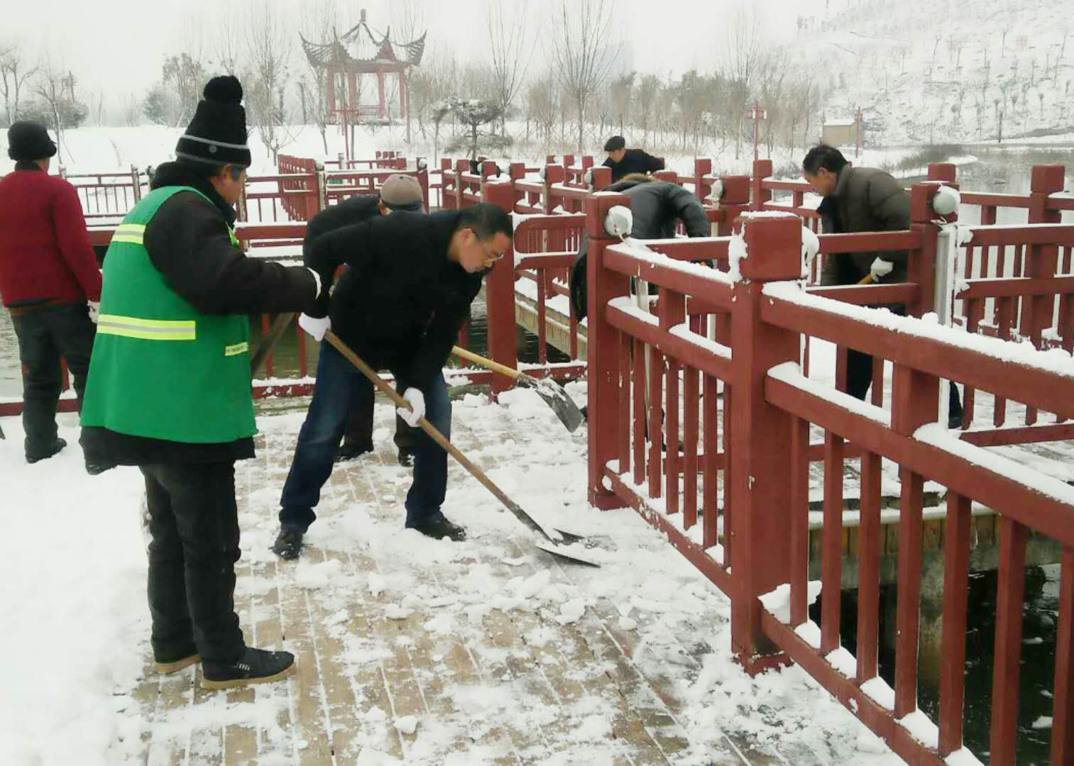 經(jīng)過兩場大雪的洗禮,空氣格外清新,但鹿邑上清湖公園內(nèi)積雪嚴(yán)重,且已結(jié)冰,給市民游園帶來了諸多不便和隱患。從早晨到下午4點半,鹿邑市政園林中心的干部職工和道德公益志愿者在上清湖集合后,投入鏟雪掃雪行動,經(jīng)過一天的緊張清掃,上清湖湖面棧道和園內(nèi)公路上的積雪清掃一遍。道德公益志愿者鐘華在微信群里提出建議后,有十幾位志愿者報名參加上清湖義務(wù)掃雪活動。