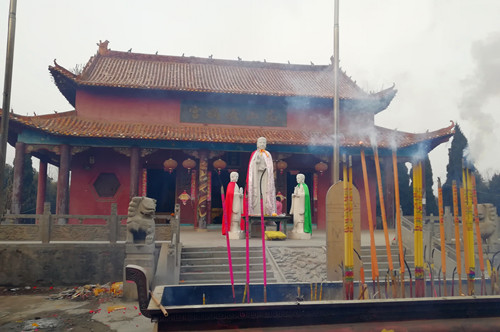 在西華這片古老又神秘的土地探尋盤(pán)古女?huà)z創(chuàng)世文化,自然少不了拜謁昆山女?huà)z宮。這座宮殿位于西華縣昆山辦事處山子頭村,因?yàn)閭髡f(shuō)這里是女?huà)z的居住地,所以在西華人心目中有著不可替代的地位。2018年元旦前夕,我們驅(qū)車(chē)前往,進(jìn)入山子頭村一路西行直達(dá)盡頭,女?huà)z宮就赫然于眼前了。待記者在宮門(mén)前站定,不經(jīng)意回望來(lái)路,竟發(fā)現(xiàn)眼前是一條坡度明顯的下坡路。見(jiàn)記者詫異,一旁的村民笑著說(shuō):“山子頭嘛,就是說(shuō)這里是山嶺的頭兒,女?huà)z宮就在最頂上?!?/p>