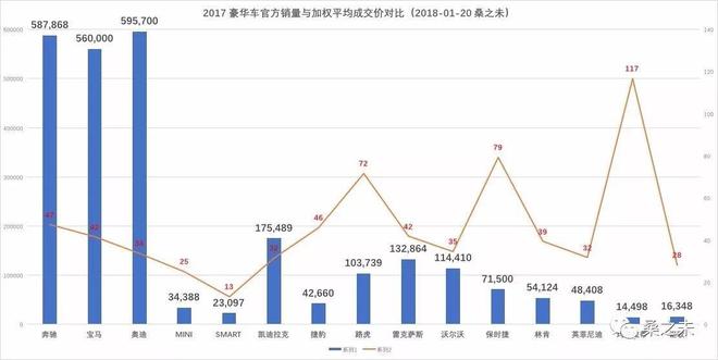 銷售的數(shù)量固然重要,但是銷售質(zhì)量也是評(píng)估銷售力不能忽視的重要指標(biāo)。衡量銷售質(zhì)量,“加權(quán)平均成交價(jià)”和“單車?yán)麧?rùn)”這兩個(gè)重要參數(shù),也許讓我們更直觀的看到車企的銷售能力與經(jīng)銷商單店經(jīng)營(yíng)質(zhì)量。這些更微觀的數(shù)據(jù)往往更能反映銷售公司及其經(jīng)銷商體系的銷售能力及水平?!凹訖?quán)平均成交價(jià)”反映車企的產(chǎn)品力與銷售公司的銷售能力,車企賣掉的車越多,單車價(jià)格越貴,品牌就越具有競(jìng)爭(zhēng)力,反之就需要考慮改進(jìn)產(chǎn)品,提升銷售管理能力。“單車?yán)麧?rùn)”指經(jīng)銷商銷售新車獲取的利潤(rùn),不含衍生利潤(rùn),一般在-4%-7%之間,如果單車?yán)麧?rùn)超過(guò)-2%,廠家需要考慮對(duì)經(jīng)銷商進(jìn)行補(bǔ)貼,如果利潤(rùn)超過(guò)7%,車企就會(huì)調(diào)整經(jīng)銷商浮動(dòng)返利。下面我們通過(guò)這兩個(gè)指標(biāo),來(lái)看哪些豪華車品牌在2017年表現(xiàn)更具實(shí)力。