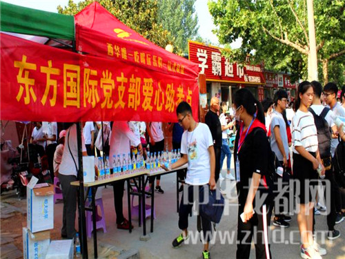 愛心助考活動現(xiàn)場,西華縣真愛醫(yī)院黨支部設(shè)立的“黨旗引領(lǐng)、護航高考”的大紅愛心助考條幅分外惹眼,黨員志愿者們免費為考生提供藿香正氣水、風油精、退燒藥等,并有醫(yī)護人員現(xiàn)場提供急救服務。在西華縣恒生醫(yī)院黨支部愛心助考點前,3名醫(yī)護人員正在免費為考生及家長提供風油精、清涼油、仁丹、藿香正氣水等防暑降溫藥品和急救藥品,還有擔架、120急救車輛等。西華縣北華醫(yī)藥黨支部愛心助考服務站的黨員志愿者,正在向考生免費提供防暑降溫藥、感冒發(fā)燒藥、拉肚子藥等藥品。黨員志愿者愛心企業(yè)代表宋女士說:“在高考期間,我們?yōu)榭忌凹议L免費提供礦泉水、芭蕉扇、清涼油等多項服務,除了愛心,更多的是一份責任和使命?!?/p>
