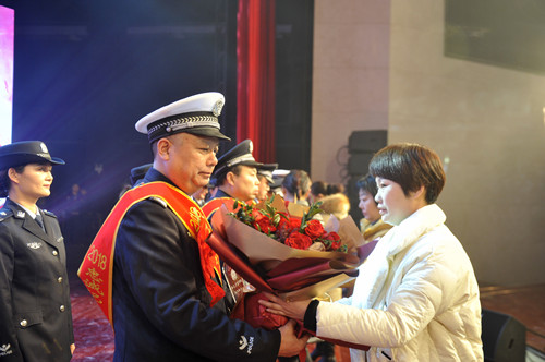 晚會(huì)現(xiàn)場(chǎng),頒獎(jiǎng)環(huán)節(jié)和文藝節(jié)目輪番呈現(xiàn),精彩紛呈。由32個(gè)民警子女上演的情景劇《天之大》,警寶們用稚嫩的聲音唱出了警察家庭的付出和他們對(duì)父母的愛(ài),讓現(xiàn)場(chǎng)觀眾流下感動(dòng)的淚水;最后一個(gè)頒獎(jiǎng)環(huán)節(jié),當(dāng)15名警嫂手捧鮮花獎(jiǎng)杯走上舞臺(tái)為他們從警10年、20年、30年的愛(ài)人頒獎(jiǎng)時(shí),整個(gè)舞臺(tái)愛(ài)意濃濃。
