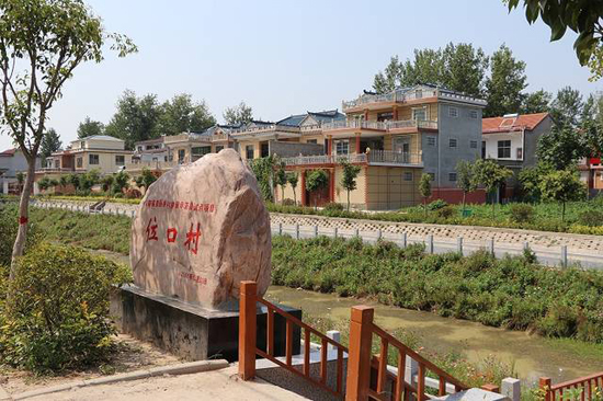 天藍(lán)水清,綠樹成蔭,九曲橋旁邊的岸上開滿了格?;?,不時有水鳥從水面掠過,這不是某個大城市的濕地公園。這是位口村的“水上公園,”如今已經(jīng)成了村里的標(biāo)志性建筑。夜幕降臨,村民們?nèi)齼蓛删墼诤舆吷⒉?、乘涼?!庇腥司幜诵∏焊裆;▋合蜿栭_,歡迎您到位口來;扶貧攻堅結(jié)碩果,村民感恩黨關(guān)懷……