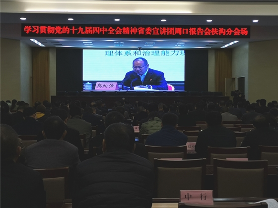 根據(jù)省委統(tǒng)一部署,11月27日,學(xué)習(xí)貫徹黨的十九屆四中全會(huì)精神省委宣講團(tuán)報(bào)告會(huì)在周口市舉行,扶溝縣四個(gè)班子領(lǐng)導(dǎo)和縣直各單位負(fù)責(zé)人在扶溝分會(huì)場聆聽宣講報(bào)告。