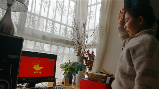 2月25日,周口市文昌小學(xué)三(5)班一名學(xué)生在家中敬隊(duì)禮、唱隊(duì)歌。自新冠疫情發(fā)生以來(lái),周口市文昌小學(xué)通過(guò)網(wǎng)絡(luò)授課方式,使孩子們停課不停學(xué)。當(dāng)日,該校組織學(xué)生在網(wǎng)上觀(guān)看“河南省少先隊(duì)活動(dòng)抗疫專(zhuān)題示范課”,讓孩子們學(xué)到了很多關(guān)于新冠肺炎的相關(guān)知識(shí)。