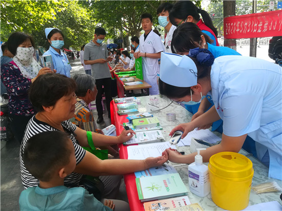活動(dòng)現(xiàn)場(chǎng),參加宣傳活動(dòng)的各單位工作人員為市民散發(fā)宣傳相關(guān)資料,并為市民進(jìn)行義診。