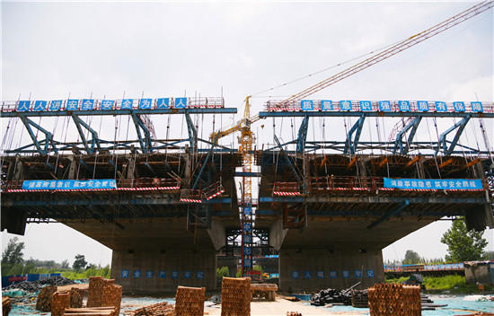 周口北環(huán)跨賈魯河大橋是我市在建重點(diǎn)工程,全長(zhǎng)904米,其中主橋總長(zhǎng)286米,共3跨,采用懸澆法施工。7月16日中午,記者在工地看到,經(jīng)過(guò)一年多的施工,工程完成80%左右,為了保障工期和質(zhì)量,工人們冒著酷暑,在跨河的兩列橋墩上,忙碌著澆鑄施工,隨著澆鑄橋體的延伸,預(yù)計(jì)年底橋體完成合攏。