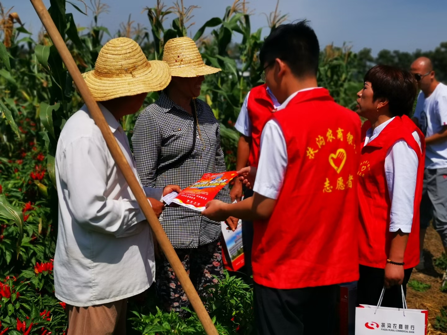 9月5日,扶溝農(nóng)商銀行大新支行“紅馬甲”們結(jié)合金融知識普及月深入田間地頭為老百姓送上金融服務(wù)和金融知識,深受村民的歡迎。