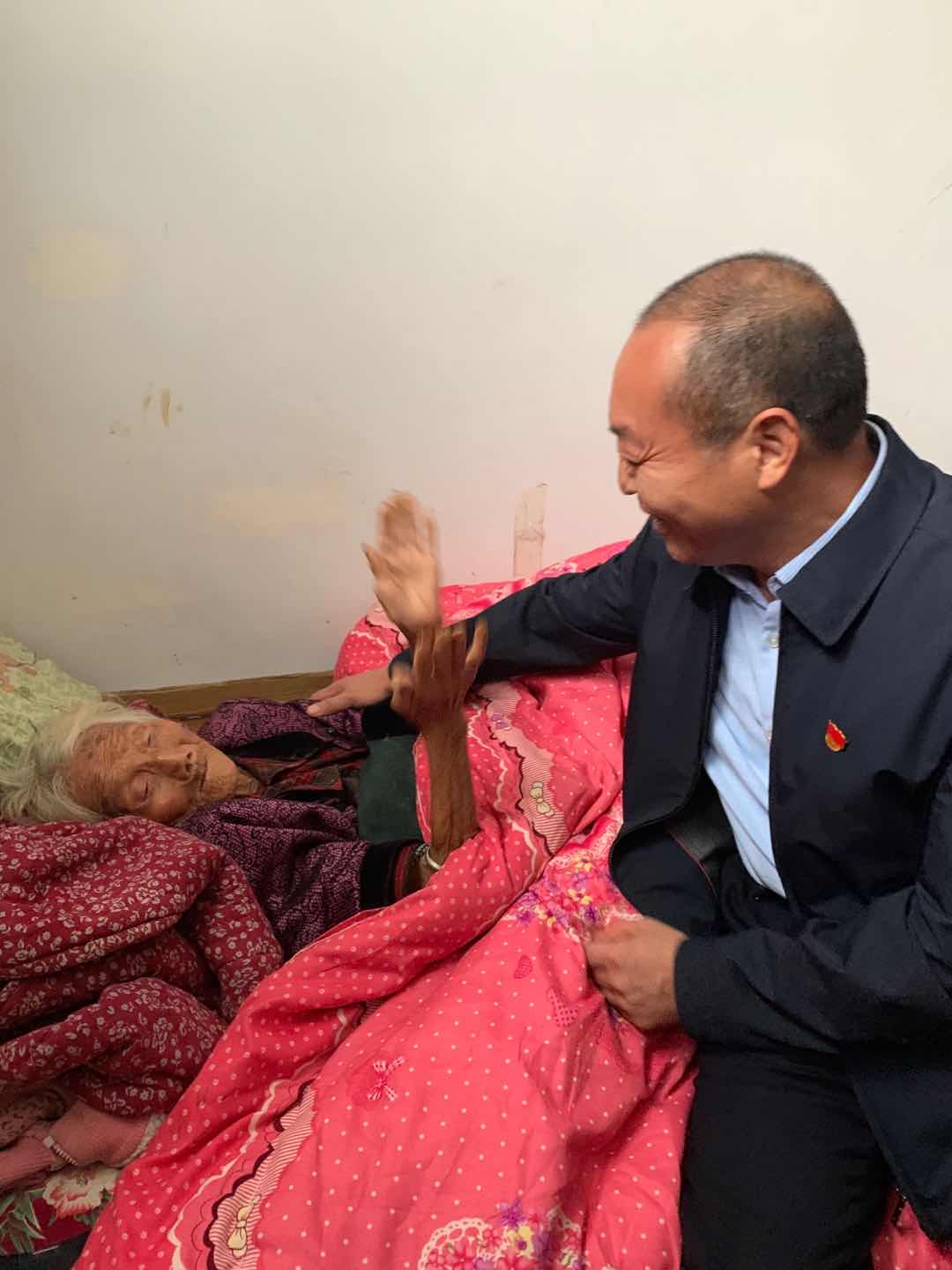 這天,方凱一行帶著嶄新的棉衣、大米、食用油等禮品,首先來到磨臺村看望107歲的老人胡有蘭。躺在床上的老人雖年逾百歲,一眼看見方凱,就認(rèn)出來了,激動地說:“孩子,你又來了?”說著,就急忙拉住方凱的手,緊緊地握著。看老人不方便坐起來,方凱便坐在老人身邊,笑著說:“是的。娘,兒子來看您啦!”