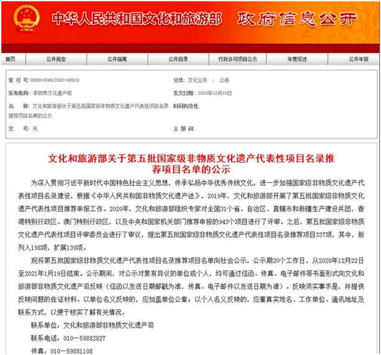 據(jù)了解,2019年,文化和旅游部開展了第五批國家級非物質(zhì)文化遺產(chǎn)代表性項目推薦申報工作。2020年,文化和旅游部組織專家對全國31個省、自治區(qū)、直轄市和新疆生產(chǎn)建設(shè)兵團,香港特別行政區(qū)、澳門特別行政區(qū),以及中央和國家機關(guān)部門推薦申報的943個項目進行了評審。之后,第五批國家級非物質(zhì)文化遺產(chǎn)代表性項目評審委員會進行了審議,提出第五批國家級非物質(zhì)文化遺產(chǎn)代表性項目名錄推薦項目337項,其中,新列入198項,擴展139項。