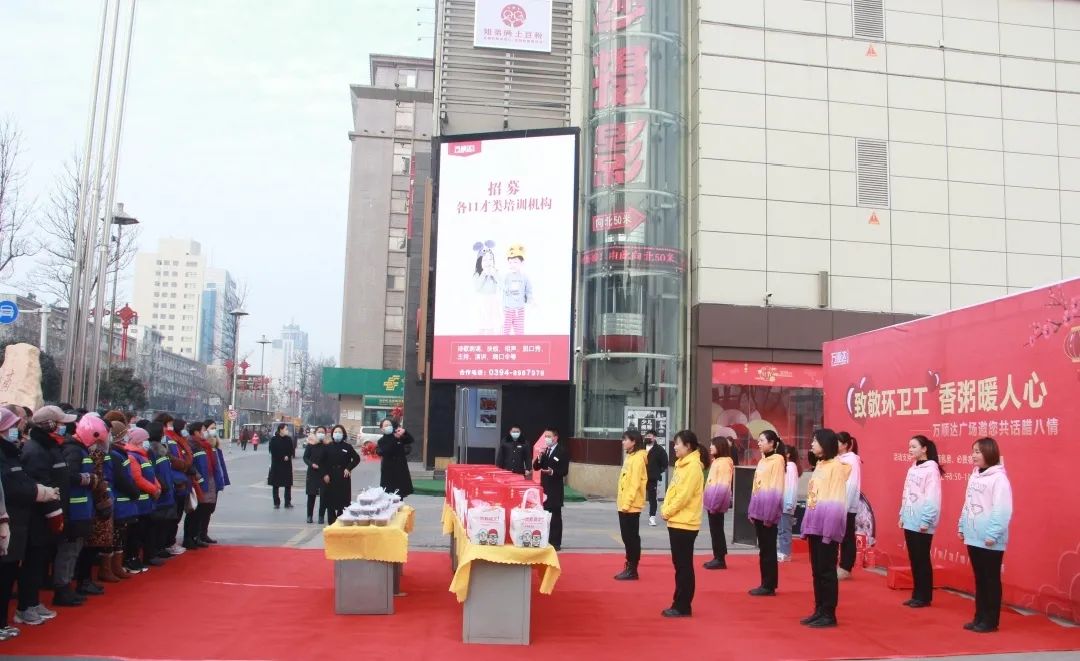 本次活動的主題是“一碗臘八粥,溫暖一座城”。當(dāng)忙碌一陣后的環(huán)衛(wèi)工人來到萬順達(dá)廣場門前時,萬順達(dá)廣場的工作人員一曲《好運來》和《你笑起來真好看》,讓整日忙碌的做著重復(fù)而又枯燥工作的環(huán)衛(wèi)工人們臉上笑開了花。