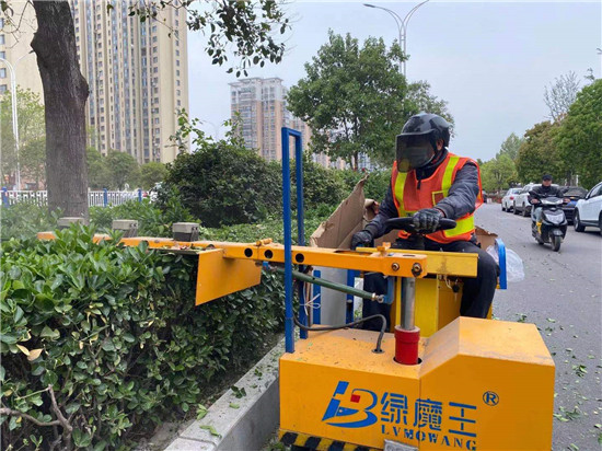 4月13日,周口大道上園林工人操作著特殊的園林作業(yè)車,修剪路邊的綠化樹,使用“電推子”,不僅提高了效率、節(jié)省了人力,就連“剃”出來的“平頭”也更平了?!半娡谱印彼街?,綠化樹被修剪得很齊整。②9
