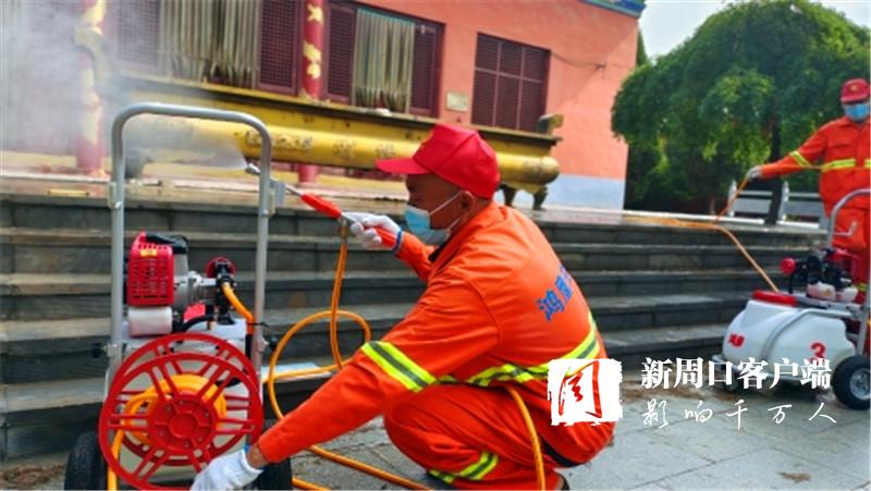 在女媧景區(qū),只見老關和其他3名消殺人員發(fā)動機器、拉出噴管、手提噴槍,一邊前進,一邊揮動,白色水霧隨之噴涌而出,所到之處細菌病毒“無處遁形”。大家齊心協(xié)力,很快就把景區(qū)的角角落落消殺個遍。