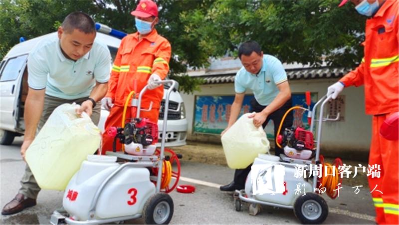 “老關,你們?nèi)膫€人去女媧景區(qū)消殺。老王,老溫你們兩個人去村莊消殺,尤其是旮旯處、垃圾堆、屋后等隱蔽重點區(qū)域一定消殺徹底,不留空白。在村莊內(nèi)進行消殺時,一定要和群眾交代好防疫消毒時的注意事項?!?月30日9時許,來自廣州市鴻鷹害蟲防治服務有限公司周口分公司的10多名愛心人士載著4臺機動手推式滯留噴霧機、1臺電動背負式超低容量噴霧機、1臺大型車載式超低容量噴霧機和230公斤消毒劑,來到西華聶堆鎮(zhèn)思都崗村后,該公司負責人許金山就向工作人員一一分配消殺任務。