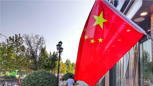 ?9月30日,市區(qū)臨街商鋪門前五星紅旗隨處可見,紅旗隨風(fēng)飄揚(yáng),將街道裝扮一新,喜迎國(guó)慶節(jié)的到來