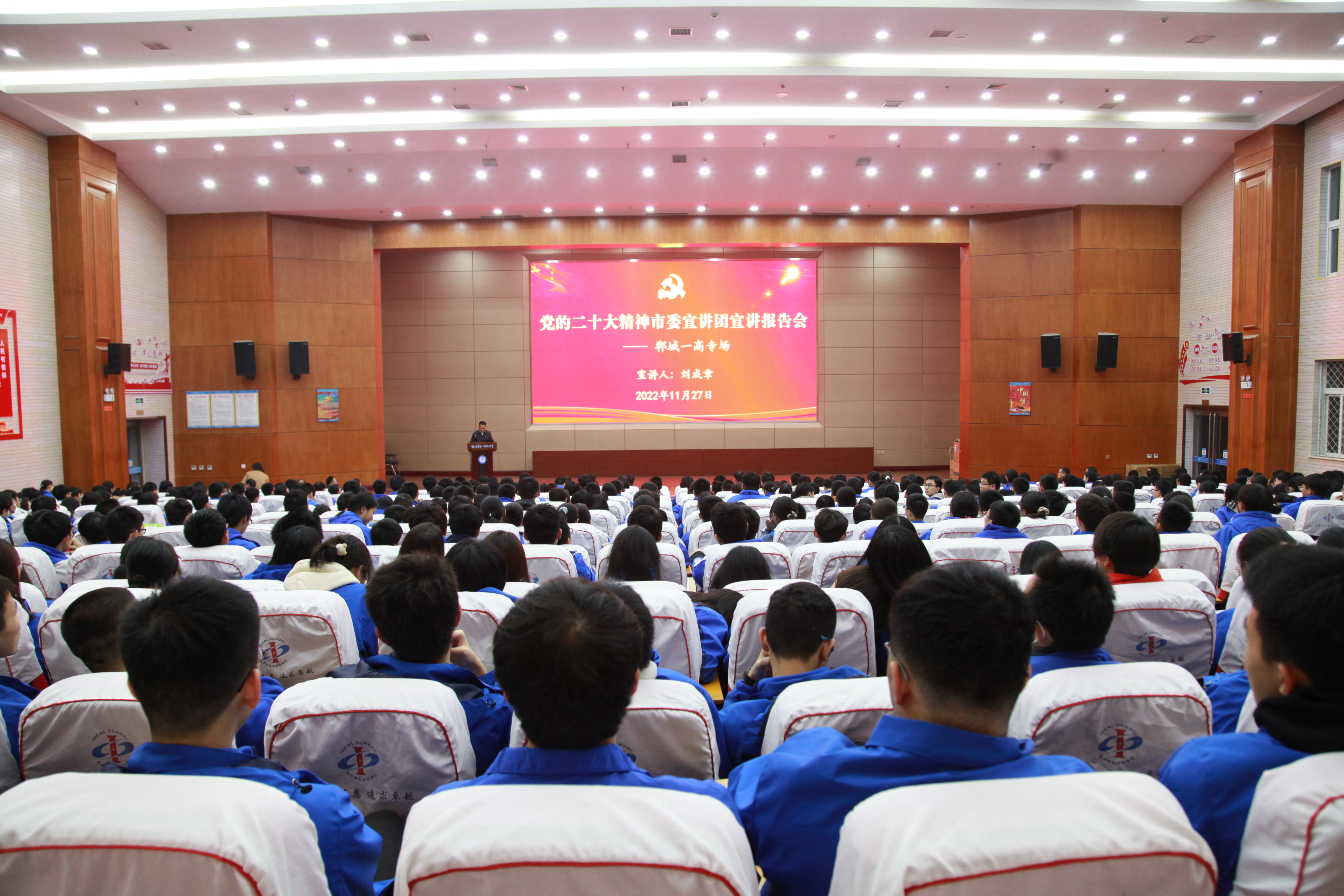“我們將牢牢抓住國(guó)家‘縣中提升計(jì)劃’政策機(jī)遇,在教育、教學(xué)、服務(wù)、管理等方面進(jìn)行優(yōu)化與完善,在拉高標(biāo)桿中爭(zhēng)先進(jìn)位,在加壓奮進(jìn)中開創(chuàng)新局,提升學(xué)校辦學(xué)水平,努力讓更多農(nóng)村孩子接受優(yōu)質(zhì)教育,為全面推進(jìn)鄉(xiāng)村振興提供更強(qiáng)大的人才和智力支撐。”11月27日晚,黨的二十大精神市委宣講團(tuán)鄲城一高專場(chǎng)宣講報(bào)告會(huì)舉行,黨的二十大代表、市委宣講團(tuán)成員、鄲城一高黨委書記、校長(zhǎng)劉成章以《學(xué)深悟透新精神 培根鑄魂育新人》為題作了宣講報(bào)告。400余名師生代表聆聽。