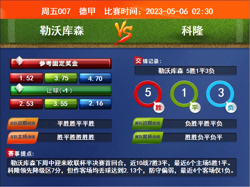 比賽時間:2023-05-06 02:30賽事提點:勒沃庫森下周中迎來歐聯(lián)杯半決賽首回合,近10戰(zhàn)7勝3平,最近6個主場5勝1平。科隆領(lǐng)先降級區(qū)7分,但作客場均丟球達到2.13個,防守偏弱,最近4個客場僅1負。