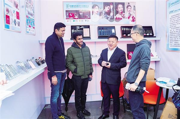11月16日,鹿邑縣化妝刷企業(yè)的工作人員向兩名外國(guó)客戶(左一、左二)介紹產(chǎn)品。當(dāng)天,鹿邑縣首屆美妝、化妝刷展銷(xiāo)會(huì)在弘道苑廣場(chǎng)開(kāi)幕。本屆展銷(xiāo)會(huì)為期3天,吸引100多家企業(yè)參展。 ...[詳細(xì)]
