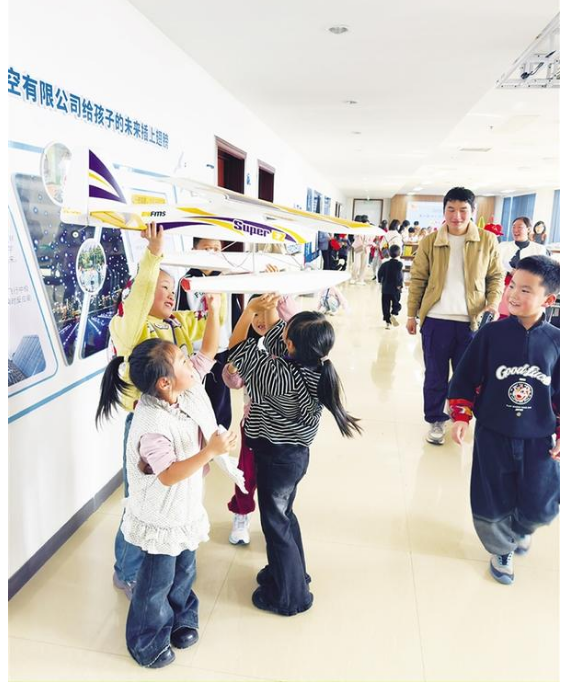 小記者近距離觀察航模。近日,周口日報小記者部攜手周報航空俱樂部,組織70余名小記者開展了一場別開生面的無人機(jī)科普研學(xué)活動,小記者在沉浸式體驗(yàn)中感受到了科技的魅力。
