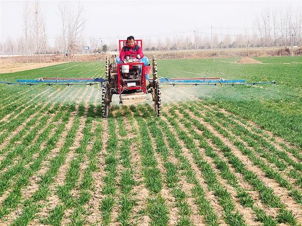 眼下正是春季田間管理的關(guān)鍵期。2月25日,在位于鄲城縣的周口市農(nóng)科院科研基地麥田里,工作人員正駕駛農(nóng)業(yè)機(jī)械噴灑除草劑。