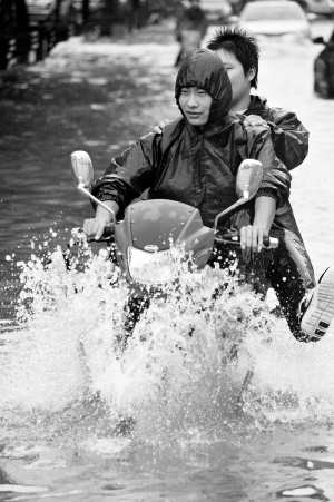 車在水中行 激起“浪花”一片 晚報記者 朱海龍 攝